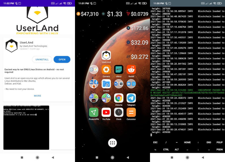 Чтобы пользоваться ими, можно запустить две сессии Ubuntu в UserLand и запустить демона и пользоваться кошельком в другой сессии. Сессии показываются в шторке Андроида (при движении сверху вниз по экрану).
