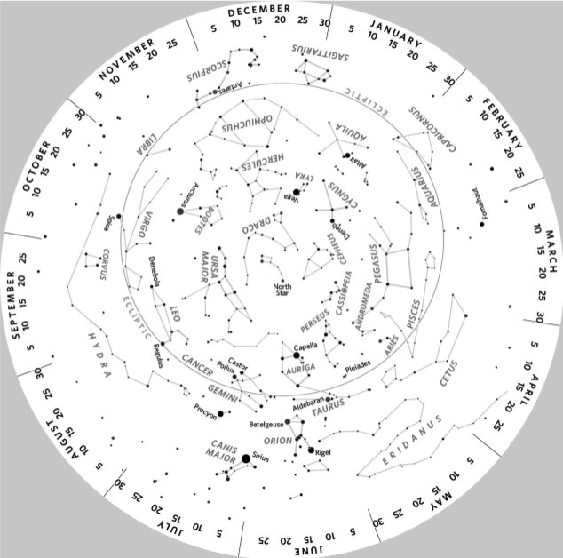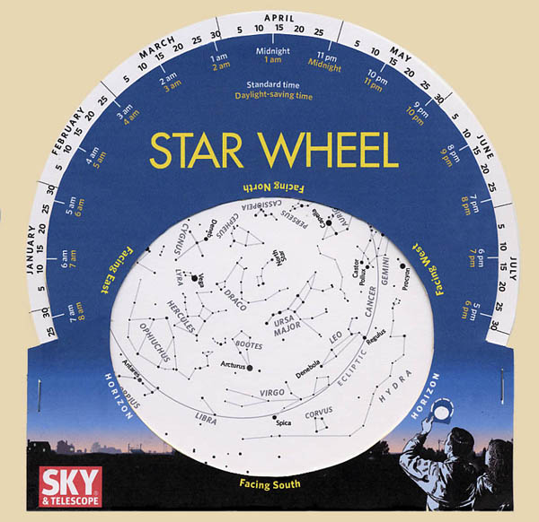 Звездное небо выглядит по-разному в разное время года. Земля совершает обращение вокруг Солнца, поэтому над головой будет различный вид звездного неба каждый месяц. Какие звезды появятся сегодня вечером? Звездное колесо подскажет в какое время и где искать звезды.