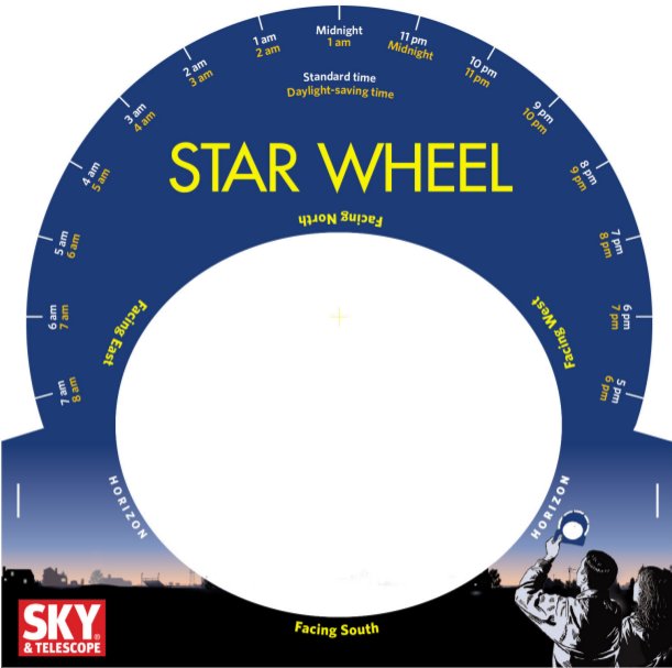 Выберите день и час, в который вы хотите наблюдать звездное небо, и установите звездное колесо так, чтобы дата совпала с нужным временем суток. Внутри овала показывается звездное небо, а края овала изображают горизонт.