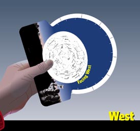 Глядя на север, держите звездное колесо вертикально, чтобы отметка Север была вверху. Повернувшись на запад, поверните звездное колесо так, чтобы вверху была отметка Запад. Так вы сможете видеть на звездном колесе те звезды, которые перед вами.